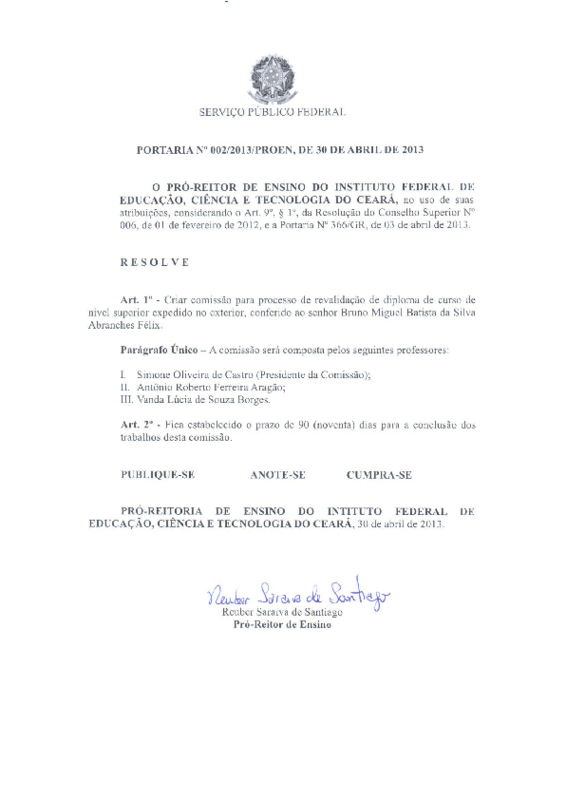Art. 1º - Criar comissão para processo de revalidação de diploma de curso de