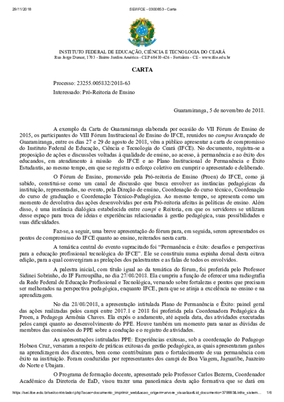 Documento redigido em colaboração com os participantes do VIII Fórum Institucional de Ensino do IFCE, reunidos no campus Avançado de Guaramiranga, entre os dias 27 e 29 de agosto de 2018. Consta nele o registro da proposição de ações e discussões voltadas à qualidade de ensino, ao acesso, à permanência e ao êxito dos educandos, em atendimento à missão do IFCE e ao Plano Institucional de Permanência e Êxito Estudantis, ao mesmo tempo, em que se registra o esforço coletivo em cumprir o apresentado e deliberado.