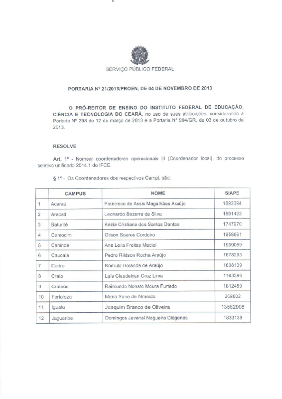 Art. 1º - Nomear coordenadores operacionais III (Coordenador local), do processo seletivo unificado 2014.1 do IFCE.