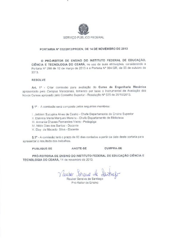 Art. 1º - Criar comissão para avaliação do Curso de Engenharia Mecânica apresentado pelo Campus Maracanaú, tomando por base o Instrumental de Avaliação dos Novos Cursos aprovado pelo Conselho Superior - Resolução Nº 025 de 25/10/2013.