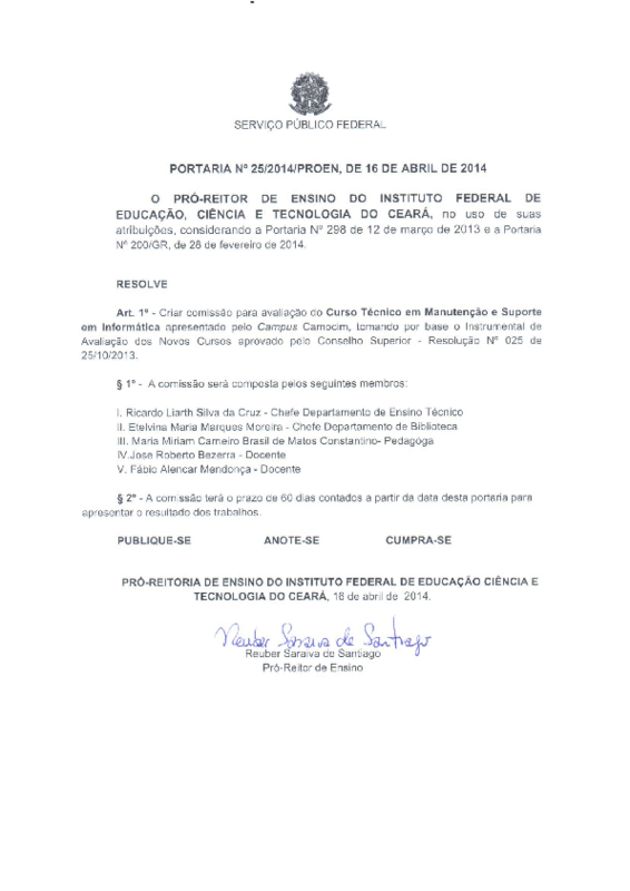 Art. 1º - Criar comissão para avaliação do Curso Técnico em Manutenção e Suporte em Informática apresentado pelo Campus Camocim, tomando por base o Instrumental de Avaliação dos Novos Cursos aprovado pelo Conselho Superior - Resolução Nº 025 de 25/10/2013.