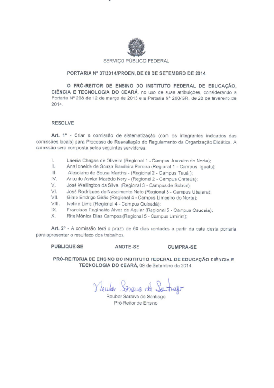 Art. 1º - Criar a comissão de sistematização (com os integrantes indicados das comissões locais) para Processo de Reavaliação do Regulamento da Organização Didática. A comissão será composta pelos seguintes servidores: