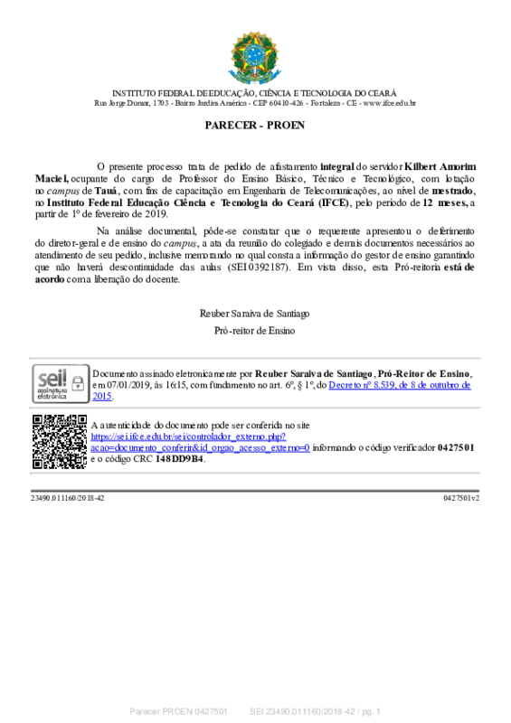 Pedido de afastamento integral do servidor Kilbert Amorim Maciel do campus de Tauá.