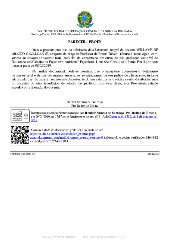 Solicitação de afastamento integral de WILLAME DE ARAÚJO CAVALCANTE - campus Tauá