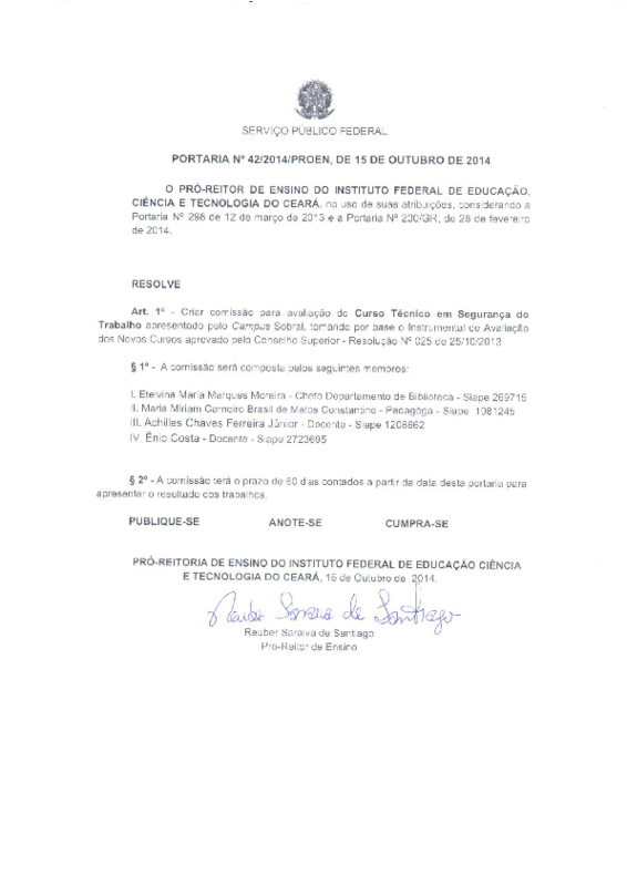 Art. 1º - Criar comissão para avaliação do Curso Técnico em Segurança do Trabalho apresentado pelo Campus Sobral, tomando por base o Instrumental de Avaliação dos Novos Cursos aprovado pelo Conselho Superior - Resolução Nº 025 de 25/10/2013.