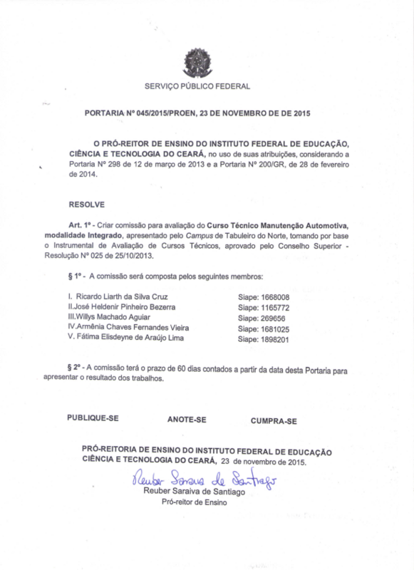 Art. 1º - Criar comissão para avaliação do Curso Técnico Manutenção Automotiva, modalidade Integrado, apresentado pelo Campus de Tabuleiro do Norte, tomando por base o Instrumental de Avaliação de Cursos Técnicos, aprovado pelo Conselho Superior - Resolução Nº 025 de 25/10/2013.
