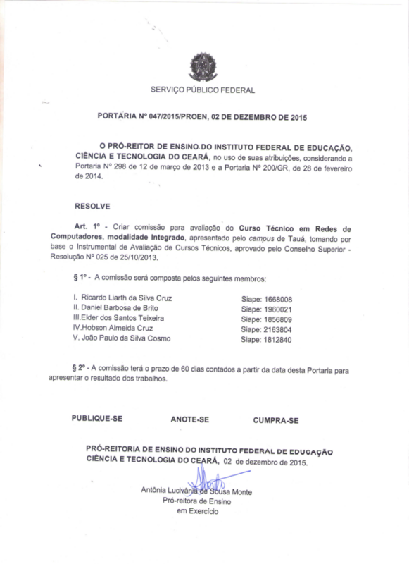Art. 1º - Criar comissão para avaliação do Curso Técnico em Redes de Computadores, modalidade Integrado, apresentado pelo campus de Tauá, tomando por base o Instrumental de Avaliação de Cursos Técnicos, aprovado pelo Conselho Superior - Resolução Nº 025 de 25/10/2013.