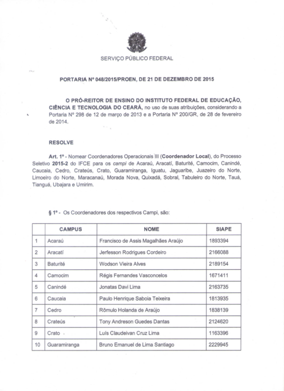 Art. 1º - Nomear Coordenadores Operacionais III (Coordenador Local), do Processo Seletivo 2015-2 do IFCE para os campi de Acaraú, Aracatí, Baturité, Camocim, Canindé, Caucaia, Cedro, Crateús, Crato, Guaramiranga, Iguatu, Jaguaribe, Juazeiro do Norte, Limoeiro do Norte, Maracanaú, Morada Nova, Quixadá, Sobral, Tabuleiro do Norte, Tauá, Tianguá, Ubajara e Umirim.